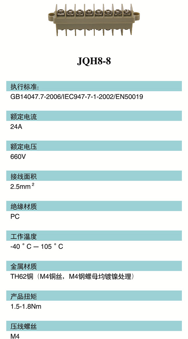 JQH8系列繼電保護(hù)端子,是為國內(nèi)外繼電保護(hù)裝置而開發(fā)的電流端子;主要應(yīng)用于各類電力,電子,儀器裝置、繼電保護(hù)裝置等機(jī)箱穿墻類型電路進(jìn)出線連接,適用導(dǎo)線2.5mm2,其設(shè)計合理,結(jié)構(gòu)緊湊