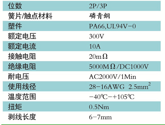 接線端子的絕緣材料用改性的尼龍(PA66),能達到或超過IEC947-7-1EN60947-7-1標準,阻燃等級達到UL94V-0具有良好的電氣性能和機械性能。螺絲用高強度的鋼制成鍍鋅或鎳處理,導電體四方針用合金銅制成表面鍍錫,壓片采用彈性及極強的磷青銅表面鍍錫或鎳;壓線框用抗應力裂縫腐蝕的合金銅制成,這些金屬表面還鍍錫或鍍鎳加以保護。設計完全符合IEC60947-7-1.GB14048.7等標準。