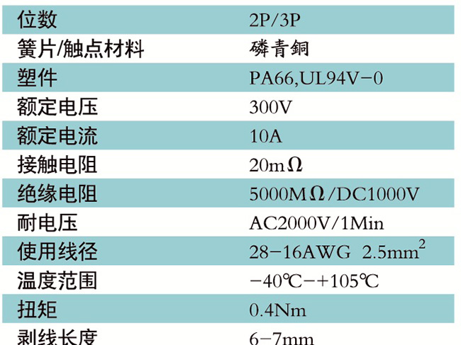 接線端子的絕緣材料用改性的尼龍(PA66),能達到或超過IEC947-7-1EN60947-7-1標準,阻燃等級達到UL94V-0具有良好的電氣性能和機械性能。螺絲用高強度的鋼制成鍍鋅或鎳處理,導電體四方針用合金銅制成表面鍍錫,壓片采用彈性及極強的磷青銅表面鍍錫或鎳;壓線框用抗應力裂縫腐蝕的合金銅制成,這些金屬表面還鍍錫或鍍鎳加以保護。設計完全符合IEC60947-7-1.GB14048.7等標準。