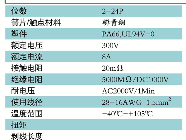 接線端子的絕緣材料用改性的尼龍(PA66),能達到或超過IEC947-7-1及EN60947-7-1標準,阻燃等級達到UL94,V-0具有良好的電氣性能和機械性能。螺絲用高強度的鋼制成鍍鋅或鎳處理,導電體四方針用合金銅制成表面鍍錫,壓片采用彈性及極強的磷青銅表面鍍錫或鎳;壓線框用抗應力裂縫腐蝕的合金銅制成,這些金屬表面還鍍錫或鍍鎳加以保護。設計完全符合IEC60947-7-1.GB14048.7等標準。